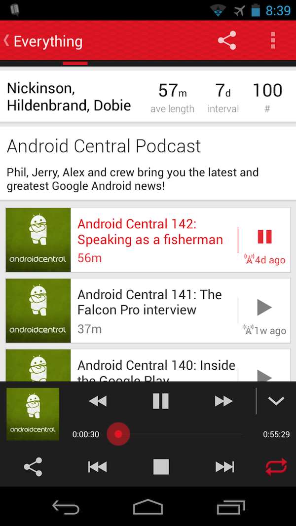 Player FM 界面清爽简洁,完全遵照 Android 4.0 设计规范。用 Google 账户登入后,却会不爽地看到空空如也的主界面。此时,选择菜单中的 Find more shows,在自己喜欢的分类后面打上星星,就能看到漂亮的「Everything」页了。