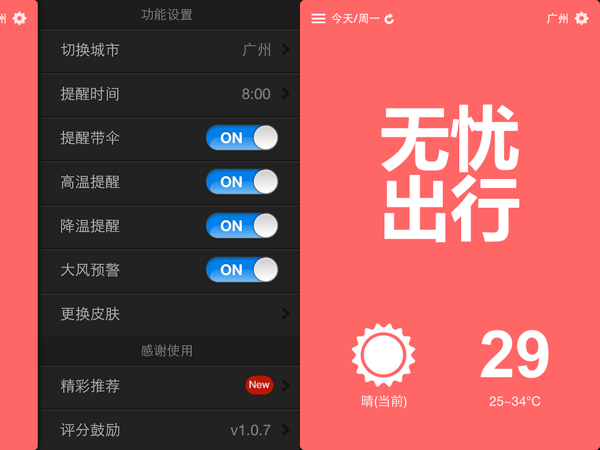 懒人天气每天会在固定时间(可自由设置)给你推送提醒下雨、高温、降温、大风等天气突发状况,如果没收到推送,你大可「无忧出行」。