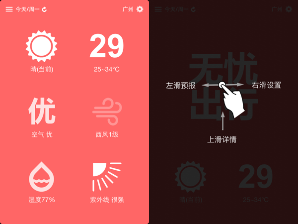 除去这个创意亮点不说,懒人天气本身设计也讨人喜欢:简洁、清新、轻巧。纯色背景 + 大号字体,一目了然是最直观的感受,另外还有手势操作加持。