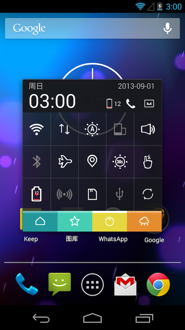点开它,可就大不一样了。首先看到的是几个快捷方式,包括锁屏、多任务、杀进程、锁定重力感应、截图等等。