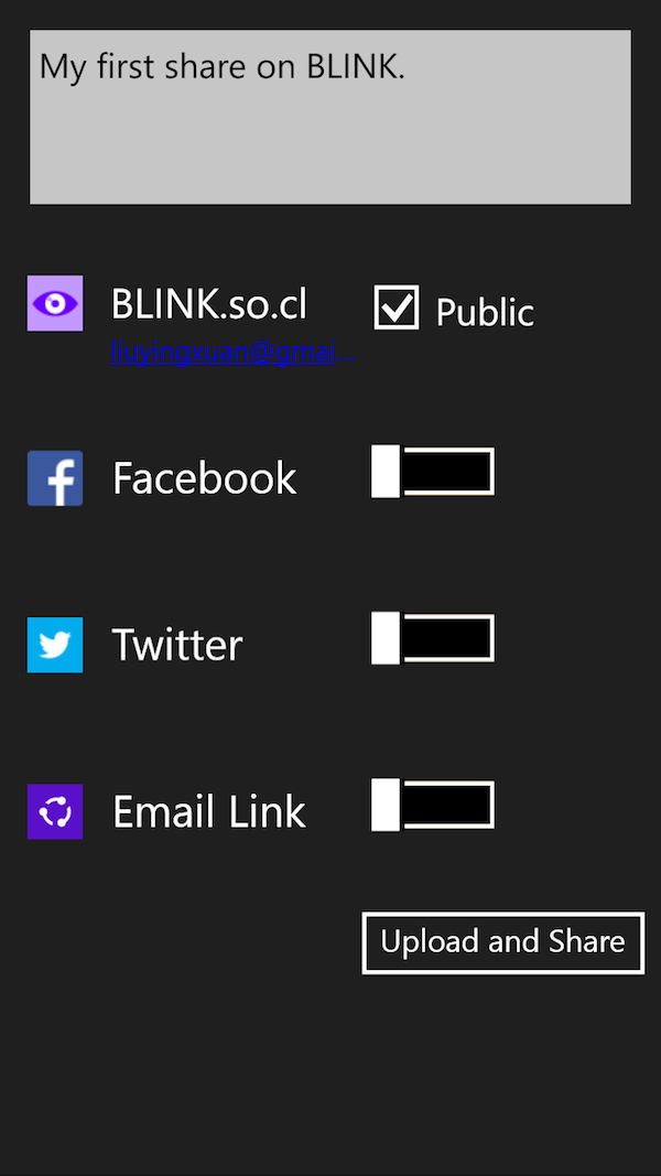 选择分享后,BLINK 会自动将图片上传到 blink.so.cl 网站,使用 Microsoft 账户进行登录。完成后,可以在选项中分享到一些完全没有用过的网站,或是将链接通过 Email 邮寄出去。