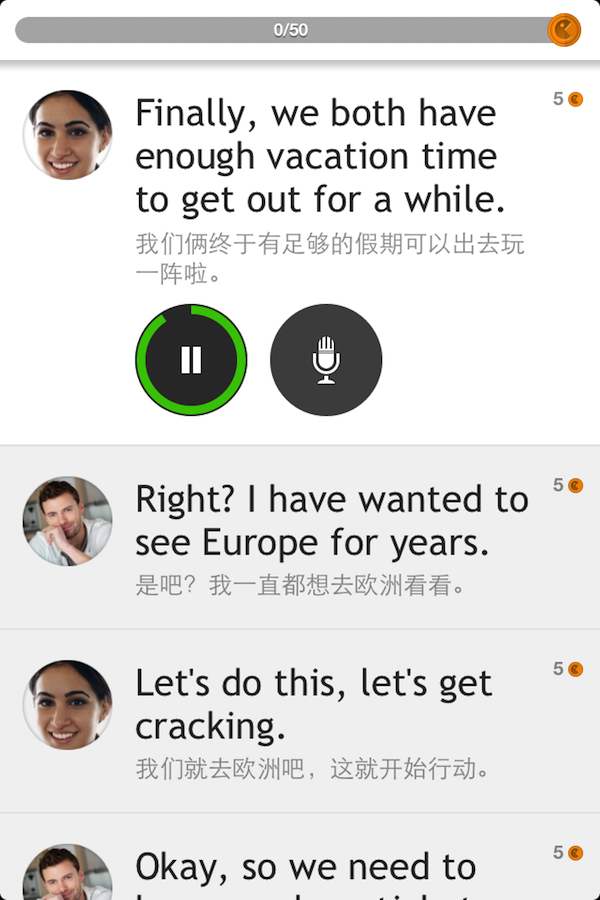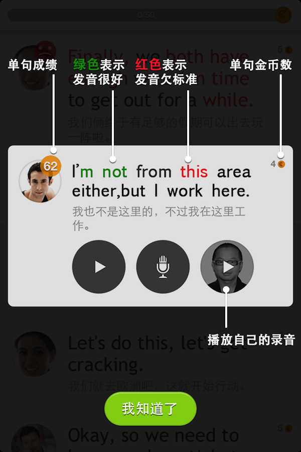 每组课程都有多句对应场景的对话,而学习每一句都可获得相应的金币。答满所需的金币,该组课程即获通过。 首先播放对话,聆听示范。