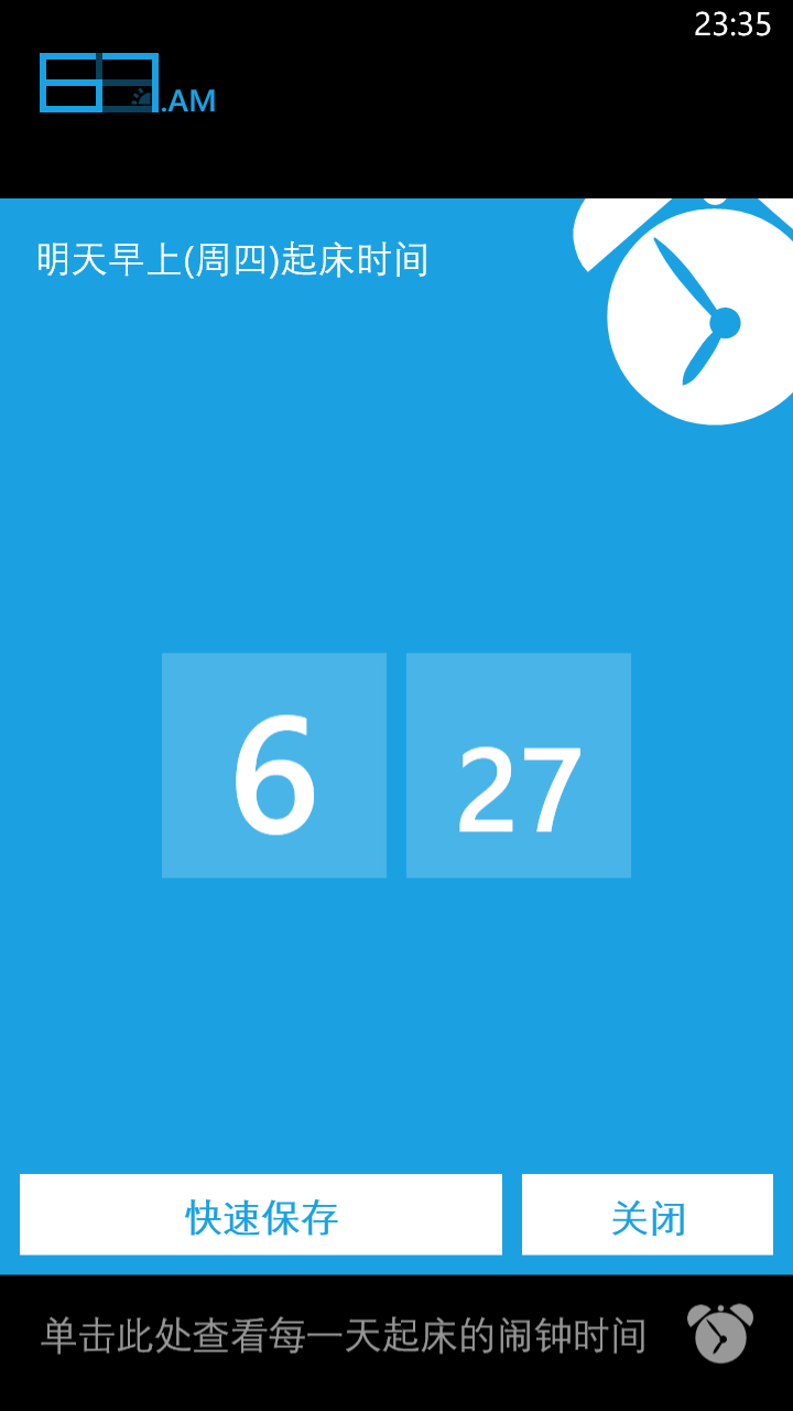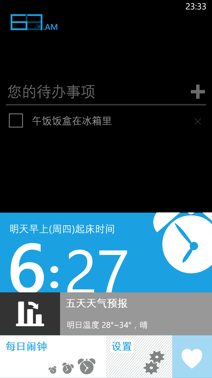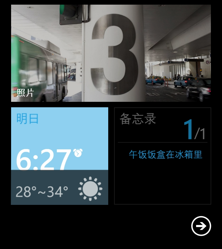 全部设置完毕后,把 627.AM 固定到开始菜单,你就会在磁贴的正面看到明日起床时间和天气,在反面看到备忘。