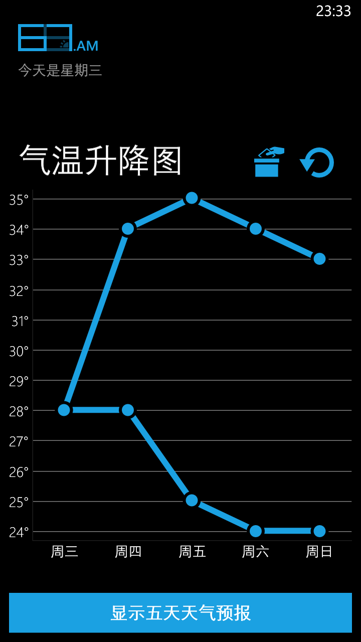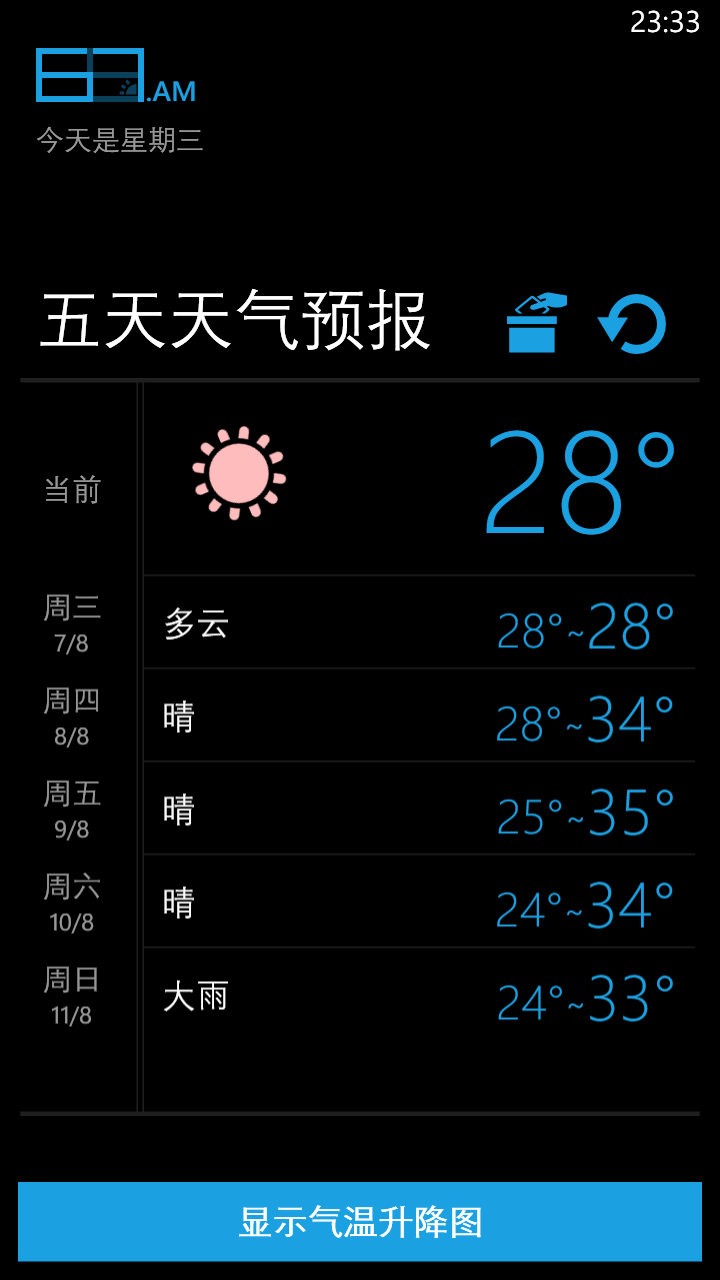 关于天气提醒,选择所在城市后,应用就可以提供五天内的天气预报,还可以查看气温走势。