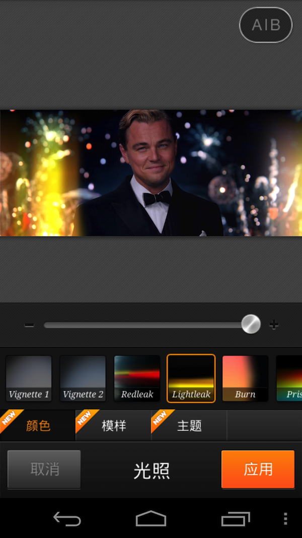 在相册中挑选一张图片,体验一下 Cymera 的强大处理效果吧。比如,在性感的盖茨比身边加上一抹光芒。