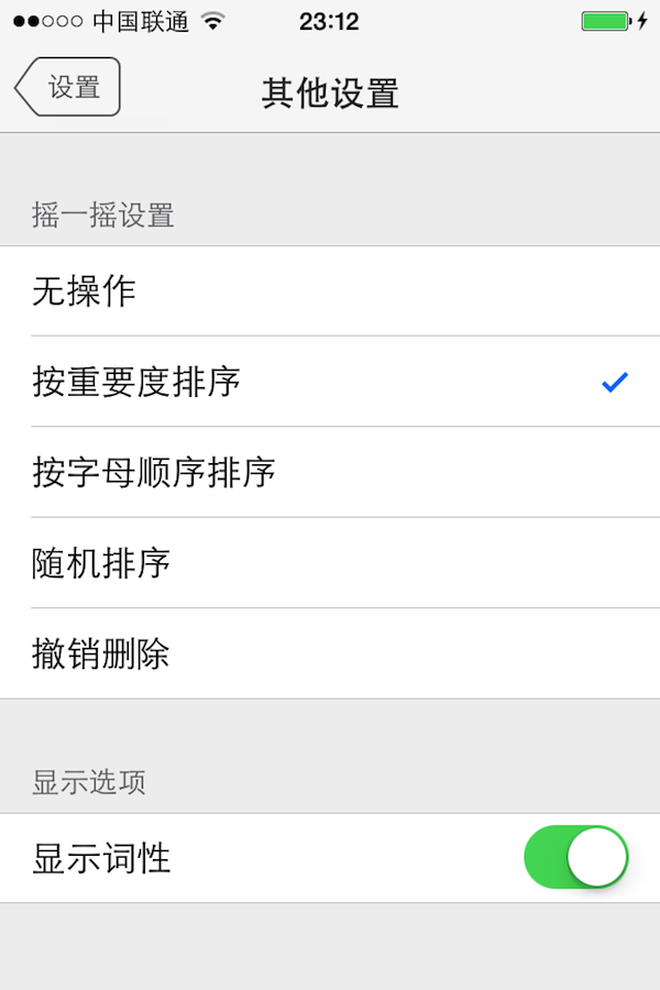 在设置中可选择摇动手机时对应的操作。例如,选择「按重要度排序」,那么摇动后,单词表中变暗的单词就会沉到最底部,高亮的单词就会浮到顶端。