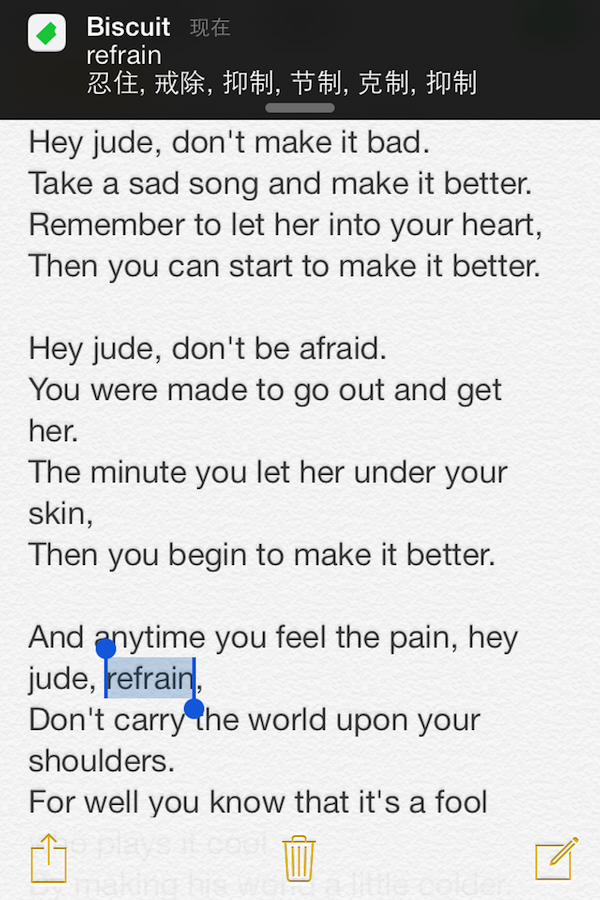 Biscuit 中还集成了跨应用取词功能 Bite。将 Biscuit 放在后台,在其他应用中拷贝单词,就可以看到弹出的通知,显示对应的释义。同时,这个单词会被放进活动的单词列表中。