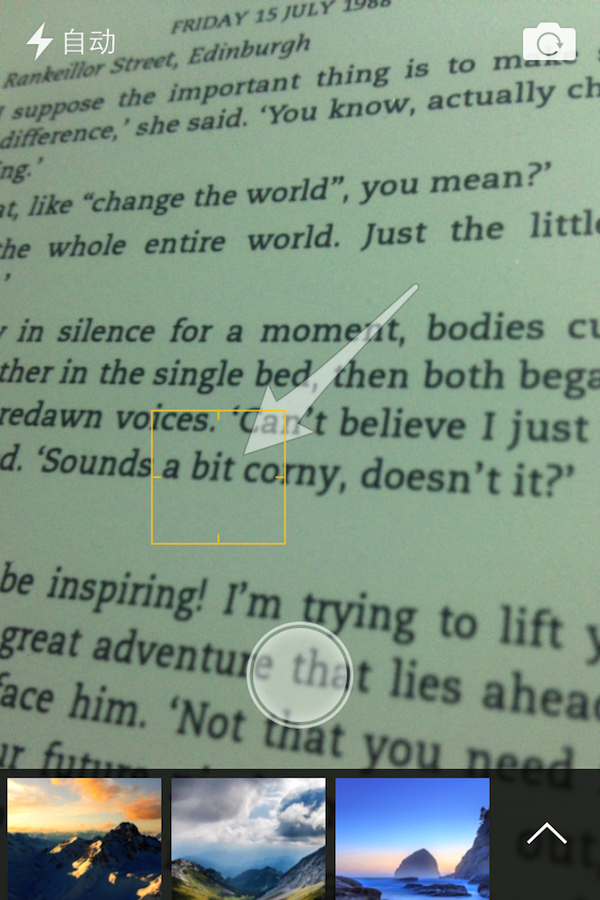 不同于以往的是,新版圈点在启动后直接进入照片拍摄界面。屏幕上的箭头指向对焦区域。如果希望调出已有的图片,点按向上箭头即可进入相册。