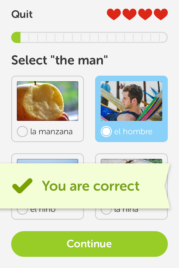 学习的过程轻松随意。Duolingo 提供了多种练习形式,只需要动动手指即可完成。比如,看图选词。