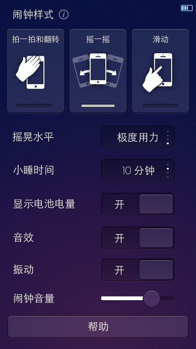 向左滑动进入设置界面。为了达到最好的「起床效果」,建议选择摇一摇模式。至于摇晃水平,你可以酌情选择,「用力」及以上较佳。