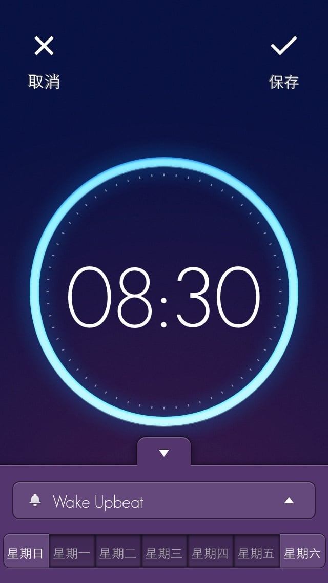 Wake 在设计上走的是极简路线,一个闹钟本来就不应该多复杂。在这个漂亮的圈圈上旋转设定闹钟时间,屏幕底部设置重复日。
