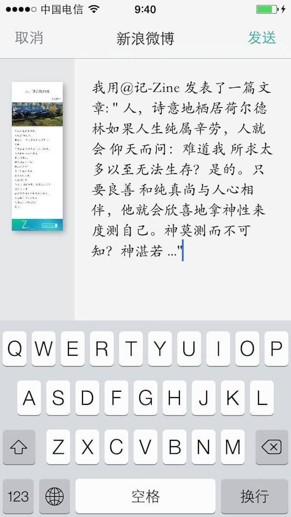 Zine 还提供了免费的云端同步,以及便捷的分享功能。对于图文并茂的作品,它还可以制作长微博来发送。连分享的界面都可以做到如此文艺,实在令人惊叹。