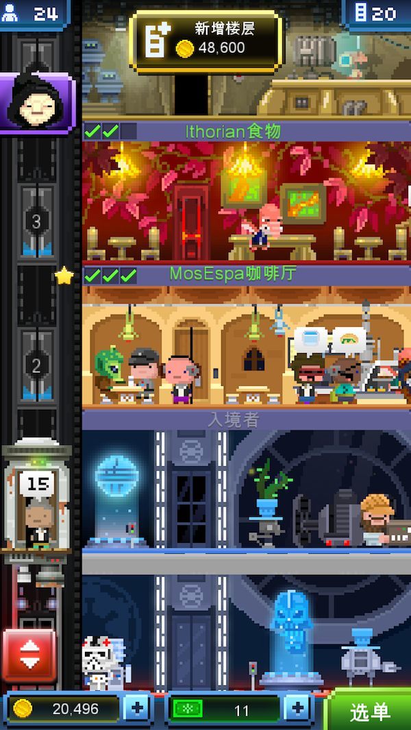 上佳的操作界面、配乐和音效。 跟大多数模拟经营游戏不同,Tiny Tower 和 Tiny Death Star 采用了完全竖向的游戏界面设计,操作起来就像看文章、刷微博一样轻松自然。另外,配乐欢快,音效精巧,听着都有好心情。