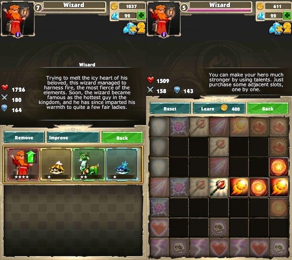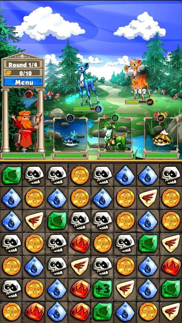 游戏的基本规则不难。每个角色有自己的属性(比如法师为火),消除相应属性的物品即可发动攻击,前提是你有相应属性的角色。当然,如果一次性消除 4 个或 5 个,那还能放放大招。