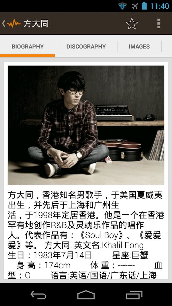 于是 AppSo 君亲切地搜了搜方大同,不仅找到了,还看到了中文介绍呢!其实,Bandhook 为大部分歌手都准备了中文版资料。