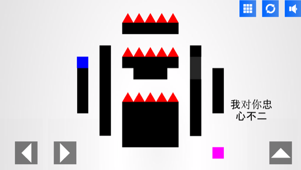 游戏玩法简单:通过爱的旁白,发散你的思维,获取游戏提示,突破爱情道路上的阻碍,最终与她(粉色方块)相拥。