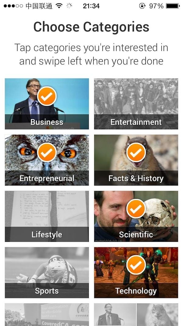 第一次进入 Umano,先选择自己感兴趣的话题。娱乐、体育、商业、科技,应有尽有。