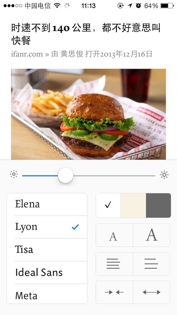阅读过程中,随意调整字体自然是不必说(不过似乎只对拉丁字母有效),Instapaper 还在同一界面放进了快速调整行距、页边距的选项。