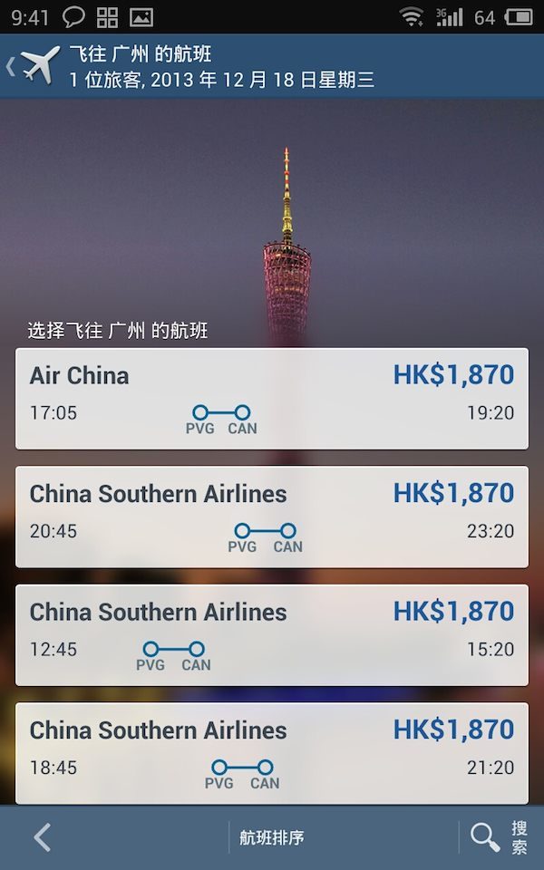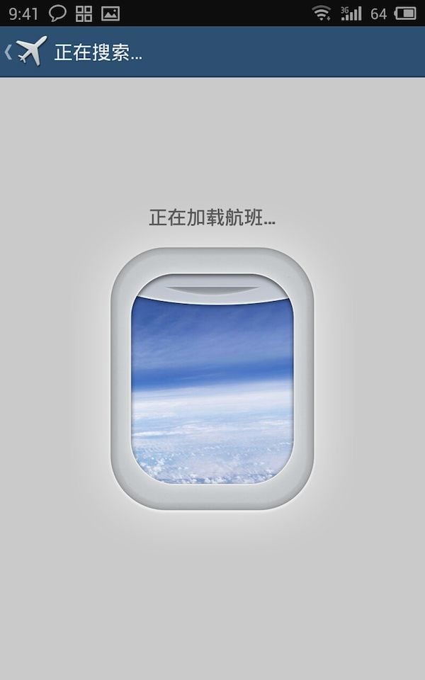 飞机已经穿过了云层,阴霾留在地上,现在是高空才有的那种晴朗。阳光有点刺眼,我准备拉下遮光板。等等,我还没起飞,这是 Expedia 手机应用的航班搜索动画——飞机舷窗。