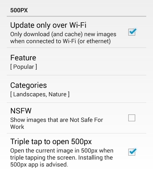你可以设置应用仅通过 WIFI 拉取壁纸,并选择喜欢的分类和内容。至于 NSFW,是问问你要不要下载一些不适合被别人看到的图片啦。对了,应用还可以设置在桌面空白处点三下,自动开启 500px 应用程序。