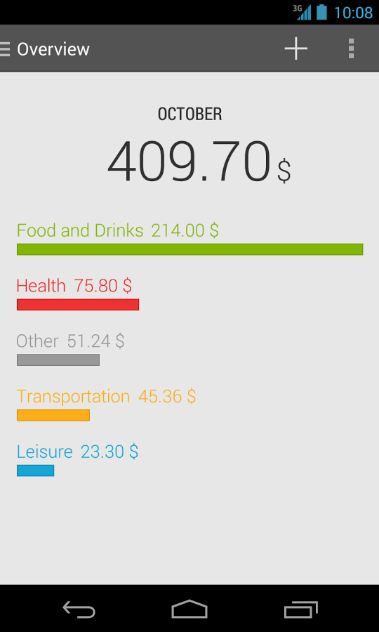 刚开始使用,只需要点击添加按钮,账务管理就会弹出一个数字输入框。输入消费后点击以下,选择一个消费类别,就记录好了一笔支出。而每次打开的主界面上,账务管理都会提示本月的消费总量,同时用一个条形图显示,不同消费类别已经花了多少钱。通过预算功能,用户可以设置一个每月的消费计划,这个提示会显示出我们离计划还有多远——究竟是压抑了非理性的消费,超额完成省钱任务;还是小手一滑,这个月到月底恐怕又要透支度日了。