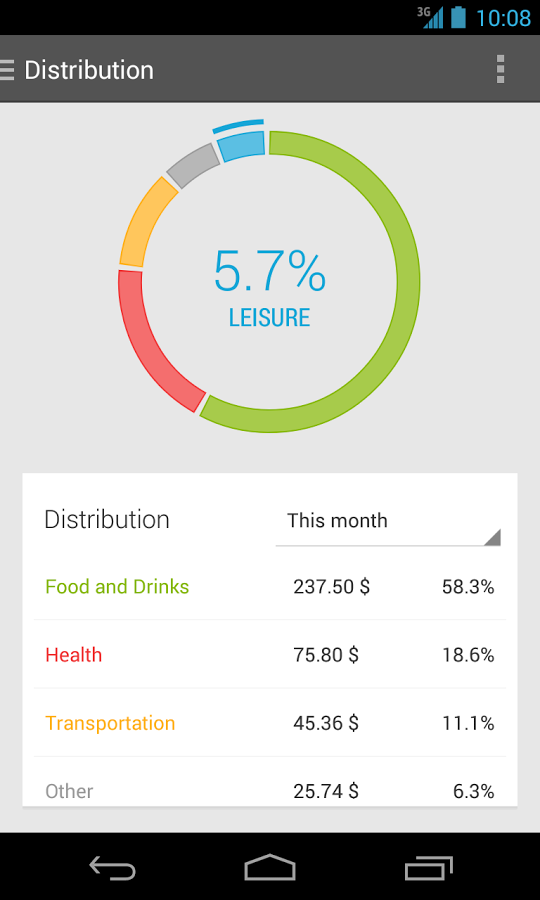 账务管理的分析功能虽然很多,但是设计却没有采用复杂的界面。相反,它走了更标准的 Android 设计路线。大部分界面都是用接近 Holo 的风格绘制的。这一点,也和简洁的诉求合拍。