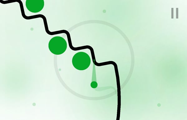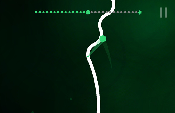 游戏以一条白色曲线作为主舞台,在曲线上有一个连接着彩色小球的圆点,彩球被圆点牵引移动,我们需要通过点击左右两侧的屏幕控制彩球,以圆点为圆心顺时针或逆时针转动,以此躲避曲线上的图形障碍,最后到达终点。