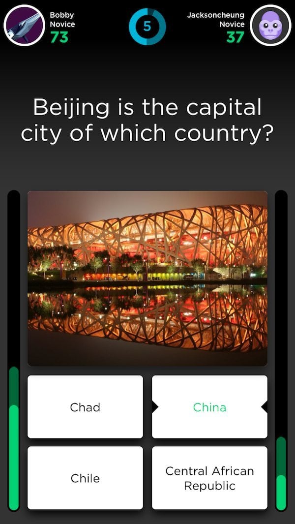 来看看我最爱的问题 — 猜首都。北京是哪个国家的首都?问题回答的速度越快,得分越高。答错自然不能得分。