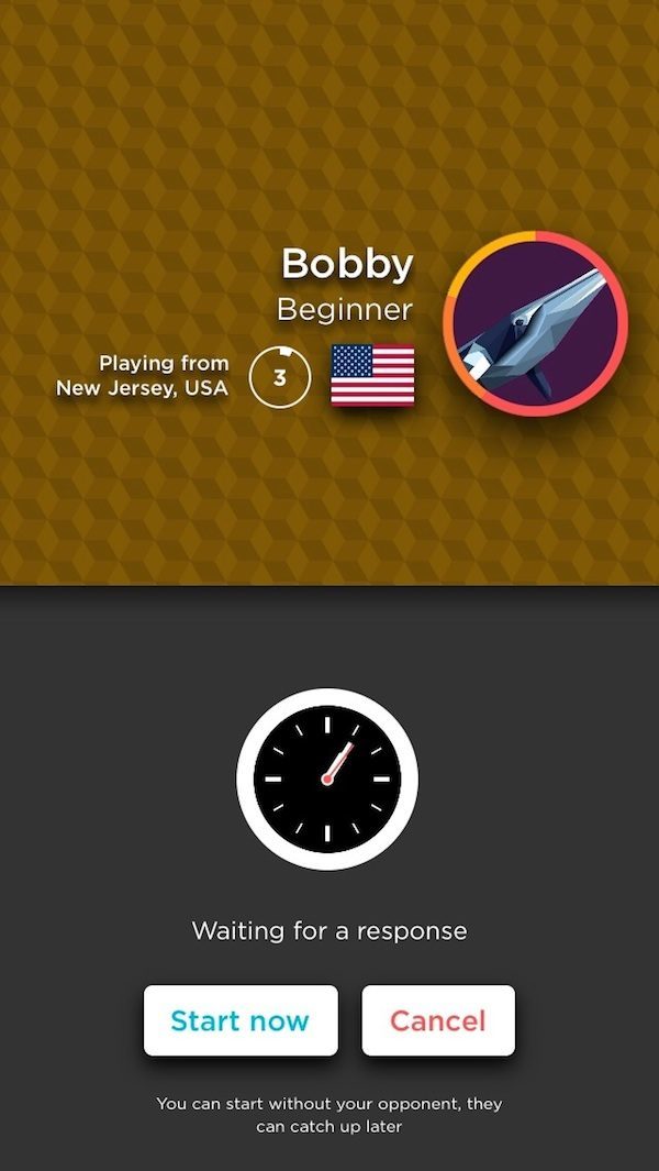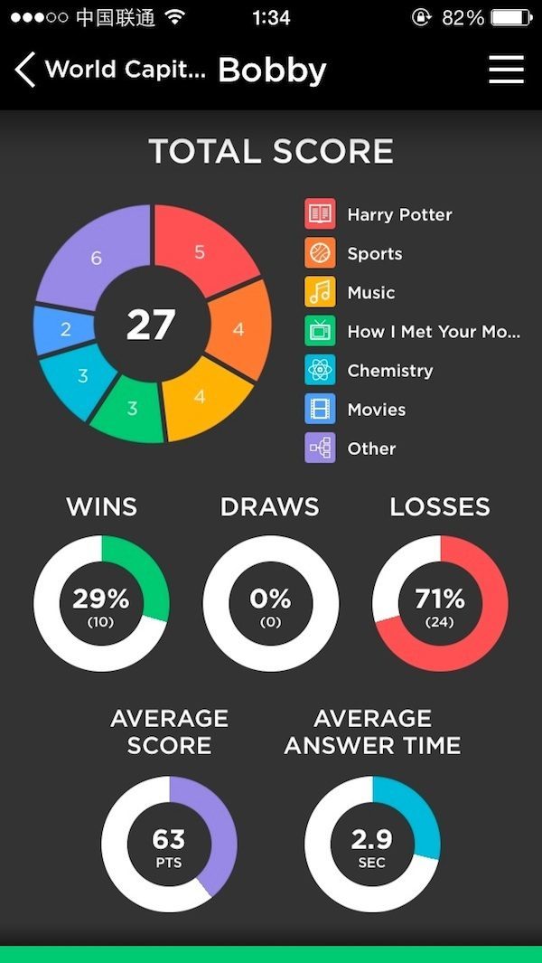 此外,还可以跟 Game Center 好友对战,哪怕对方暂时不在线也没关系。在 QuizUp 中选择用户,然后发起「挑战」,不用等到对方接受,你就可以先开始游戏。等他们有空的时候再作答同一套题,系统会自动比较双方的结果,并决出胜负。