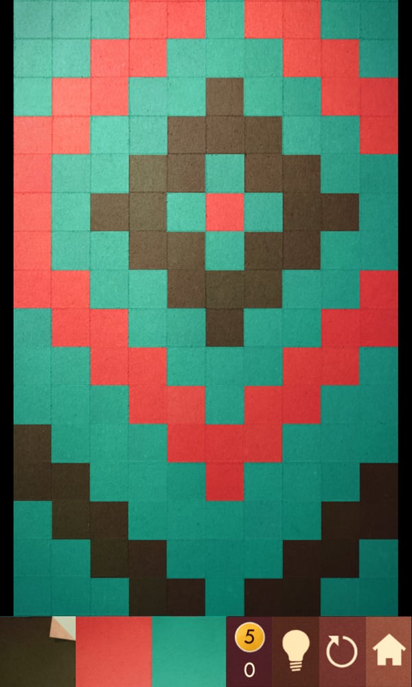 游戏的玩法独特,但简单易懂。每个关卡场景由红、绿、棕三色交错的彩纸构成。我们需要在屏幕下方的“色块”区域选择好所需的颜色,点击某区域内的任一块“色块”会激活一组全方向该颜色的骨牌波浪,这时该区域就会被全染成所选颜色,当所有区域被染成同一颜色后即可过关。