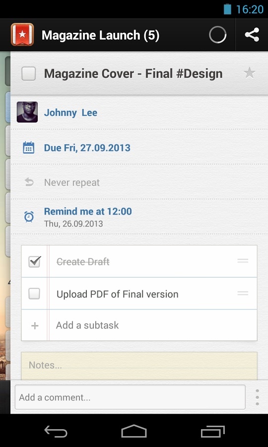 添加任务,添加分类,以及子任务、笔记、提醒,这些同类应用需要有的功能,都可以在这个界面中方便的完成。可以说,Wunderlist 并不追求手势操作等流行概念,用简单的方式把事情做好才是它关注的。