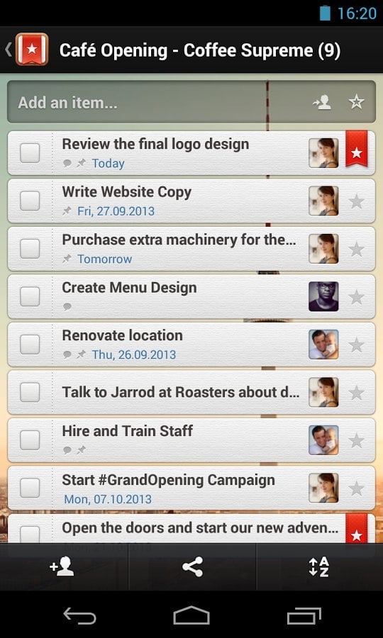 这款应用的特点有二:一是精致流畅的拟物界面。经历了 2013 年设计趋势的更迭,Wunderlist 仍旧没有制作扁平化的界面。默认的木质纹理背景,加上纸质纹理的笔记、事项,在如今居然显得有些老派。(注:Wunderlist 提供完整的中文界面,配图为官方示例图。)