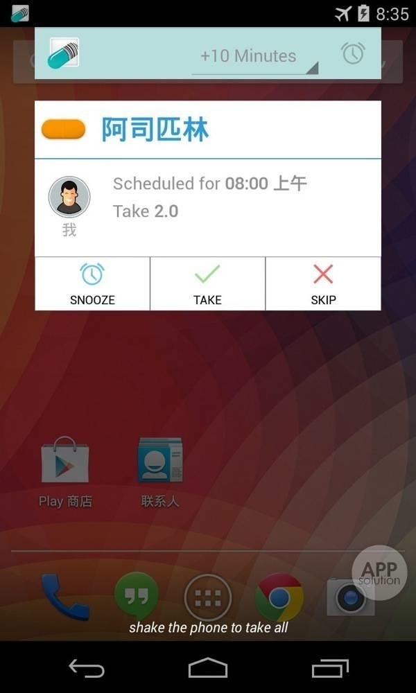 到该服药的时候,手机就会发出摇晃药瓶的声音,同时弹出提示。这时候,摇晃手机,MediSafe 就会认为你已经服下了这些药物;如果按下「跳过」或是置之不理,MediSafe 就会在主界面中,将对应的药物打上标记。