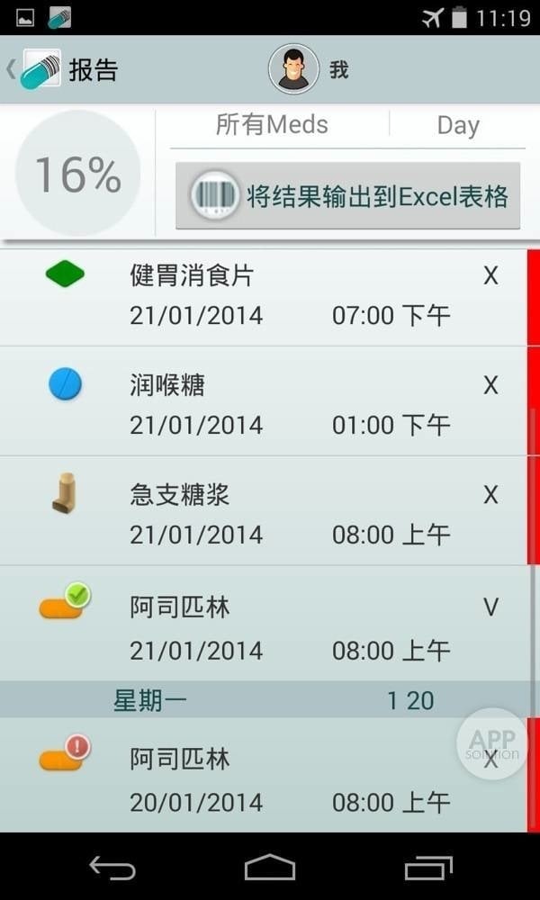 最后,MediSafe 还有一个貌似很蛋疼的功能:查看自己所有药物的服用情况,计算「按时服用率」,甚至导出 Excel 表格……