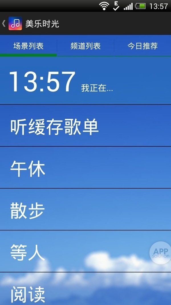 一个炫彩音符开场画面之后,美乐时光并没有播放音乐,而是给你一系列「场景」。场景,就是学习、工作、约会、驾驶,甚至上厕所这样的使用环境和心情、状态,选择一个,美乐时光会开始给你播放一系列音乐。相对于很多电台把算法和歌曲列表完全隐藏的做法,美乐时光做了这种处理。