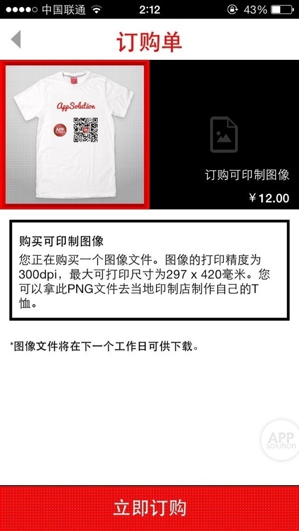 接下来,说说具体的购买方式。AppSo 君遗憾地发现,你无法免费获得自己设计 T 恤图案的可印制版本。要取得可以用于 T 恤转印纸打印的图案,你必须像购买其他设计师的创意一样,通过 12 元的应用内购买,并于次日下载该图案。猜测其中原因是 Snaptee 方面需要对图案进行特殊优化与处理,而这不是免费的。