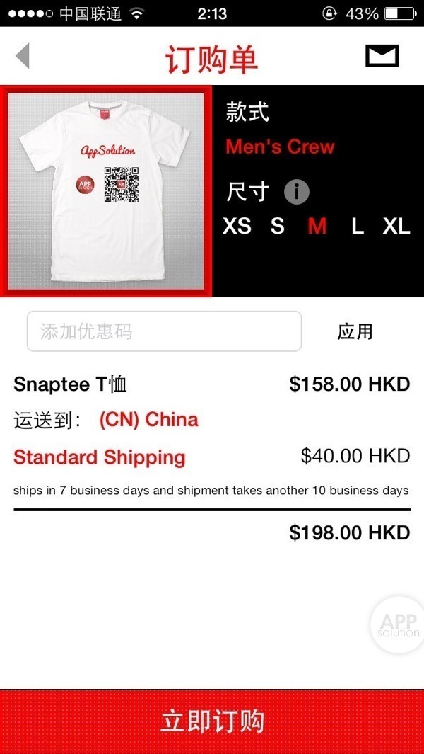 如果要直接购买自己或别人设计 T 恤的成品,则不再经由应用内购买,而需使用 PayPal 或国际信用卡,略显繁琐,而且不确定究竟能不能邮寄来中国大陆。因此,AppSo 君建议有条件的读者还是将图案送到打印店,或是自己动手、通过特殊的 T 恤转印纸来印在白 T 恤上吧,既便宜又好玩。