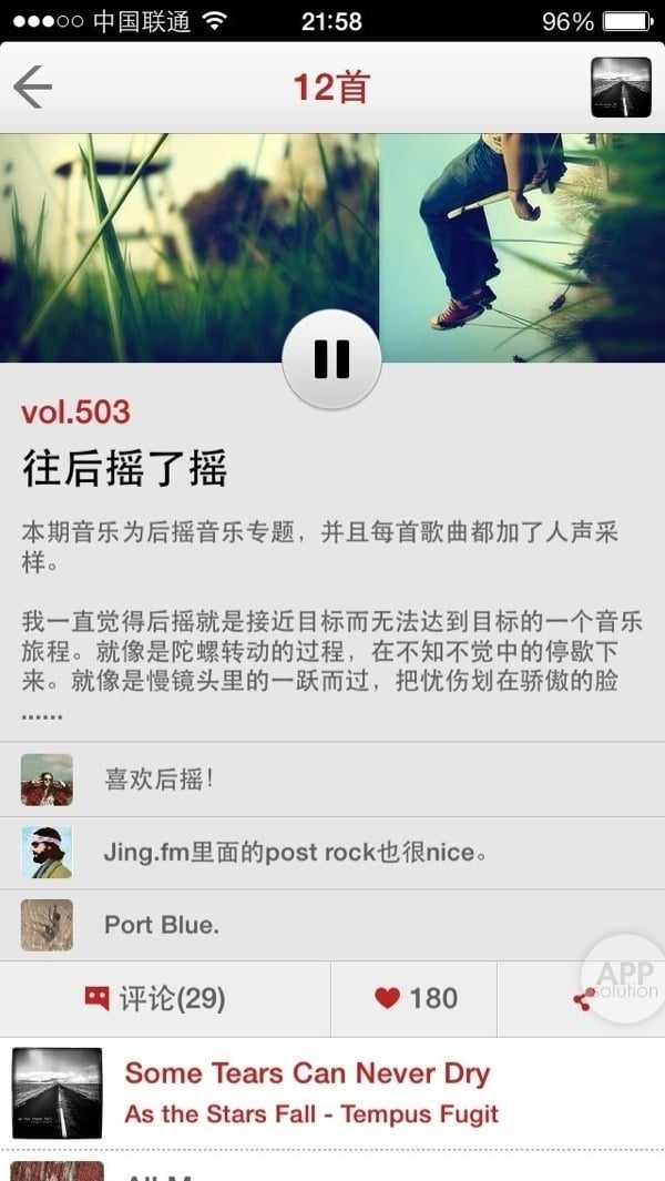 进入一期精选,你会看到一个清新的主题、一段编辑对主题的注解,还有一群音乐同好七嘴八舌的讨论。向下卷动,就是曲目列表。