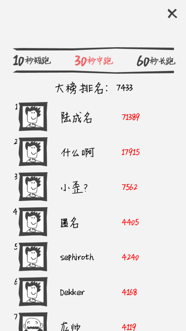游戏分为:10 秒短跑、30秒中炮、60 秒长跑。如果你是一位「真汉子」想必一定能顶住 60 秒的漫漫长路(手都抽筋了,有木有!)。每一次奔跑过后的成绩,都会结算出全球排名,当我看到排行榜中前 5 位跑者的成绩后,不禁惊呼:何方大神才能练就这一手神功!