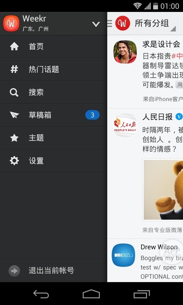答案是,几乎没有。这款微博客户端可以用中规中矩,四平八稳来形容。右侧侧滑菜单,点击微博卡片进入详情页,三个 tab 页分别是时间线、消息和个人主页。不仅仅布局和操作,连一些元素都是非常标准的 Android 4.x 风格。然而,通过灵活得当地运用这些设计元素,Weekr 可能是最易学的微博客户端。也因为没了多余的交互和功能,简约易用的特性就非常明显了。