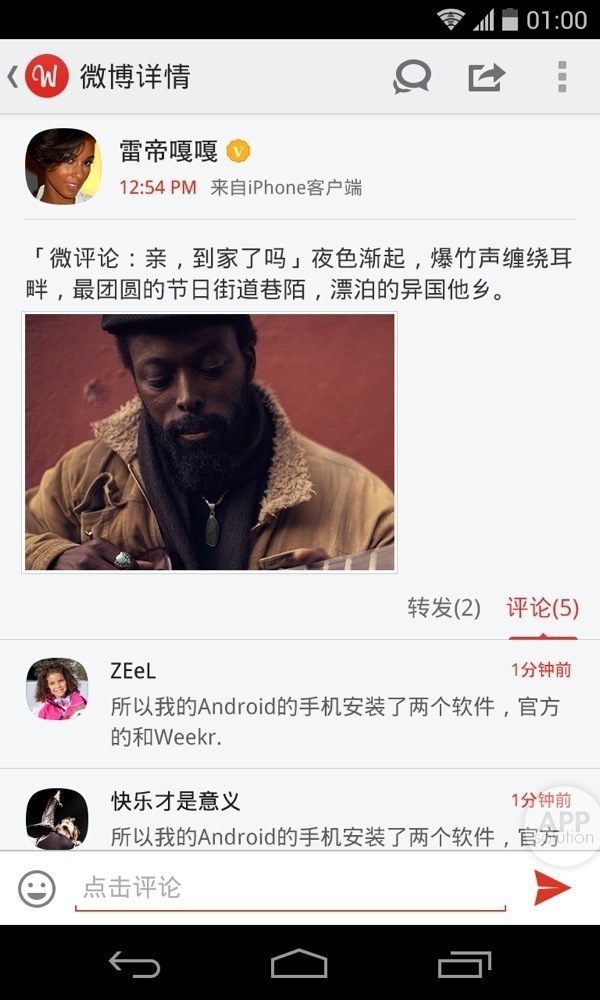 不过度设计并不是没有设计。热门话题的渐变色、切换多账号箭头的小动画,以及在微博详情页可以呼出的转发、评论菜单栏,这些设计都非常精巧、直观。整个应用,大概只有长按微博呼出的菜单隐藏的比较深。还好,这不是一个常用操作。