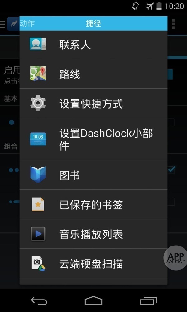 最精彩的是,你可以赋予某个手势「全屏」的动作,即隐藏屏幕下方困扰已久、占据不少空间的「三大金刚」,还自己一块完整的屏幕。在 Android 4.4 下,「全屏」动作即为启用「沉浸模式」,无需 ROOT 即可实现。