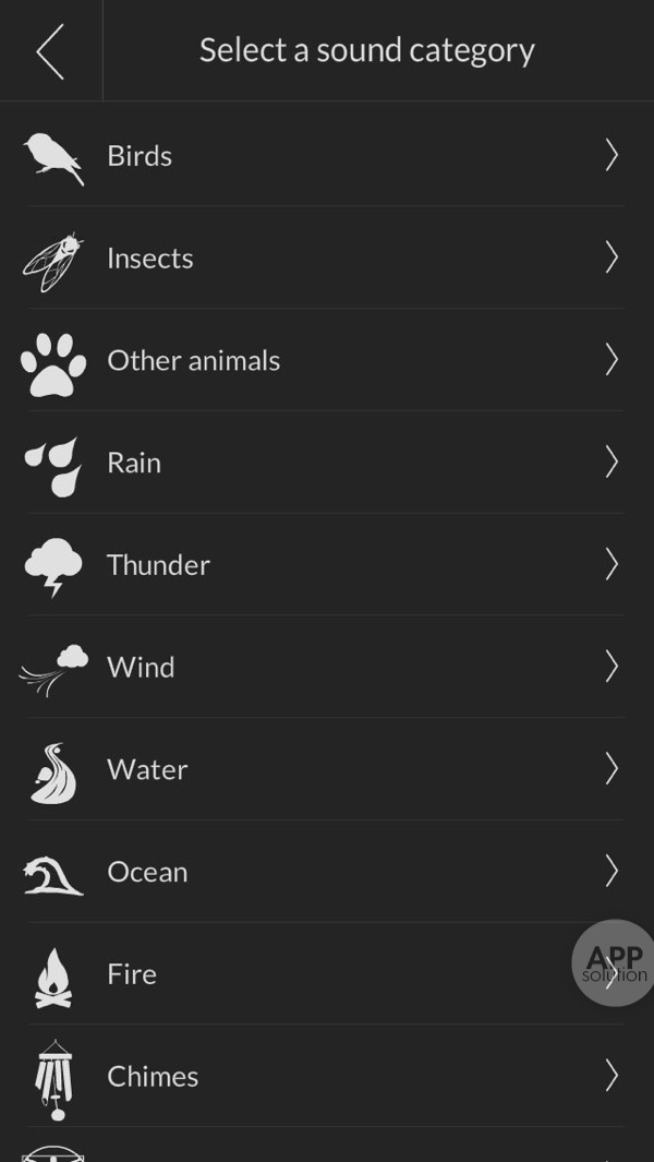 打开声音列表,你会发现各式各样自然的声音。鸟鸣、蝉鸣、风声、雨声、雷声、流水、竹子,甚至心跳、白噪声。每个声音分类中至少会有一种免费声音可供使用,其余的需要通过内购解锁。