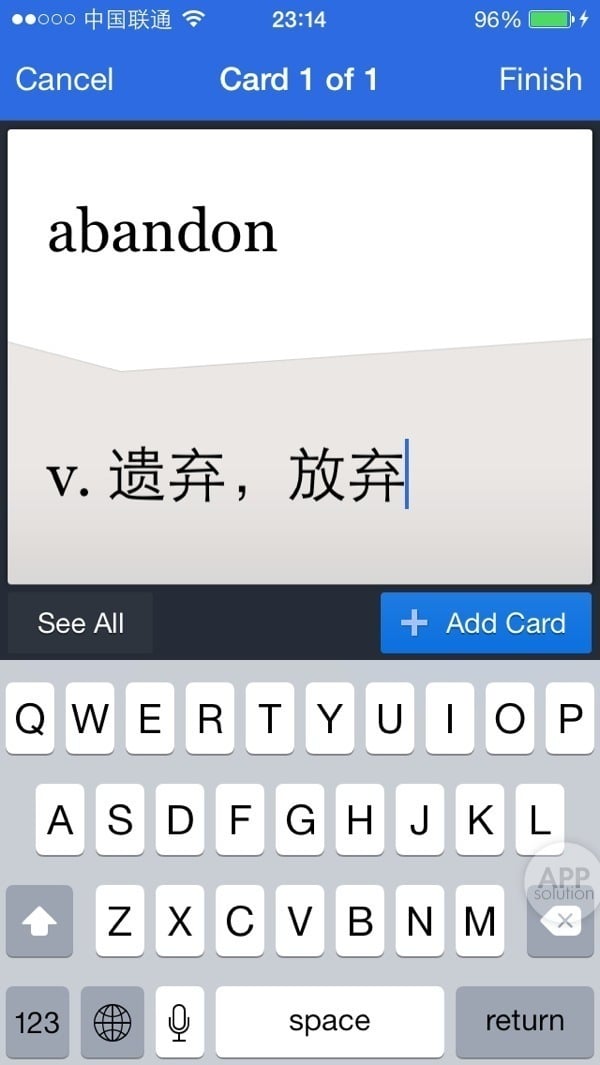 看,开始输入第二张卡片的时候,Quizlet 就已经聪明地准备好啦。建议使用 Quizlet 网页版来建立词表,它能为每个单词自动匹配中文释义,省去了我们大量的工作。