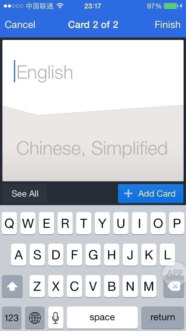 输入单词和释义之后,Quizlet 会提示你指定卡片的正面和背面的语言。AppSo 君选择英文-中文,Quizlet 就会自动匹配词语的发音、字体。当然,如果你要用 Quizlet 来学习其他语言的内容,指定相应语言即可。