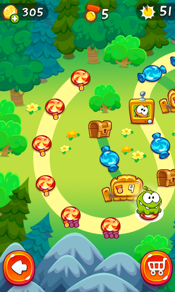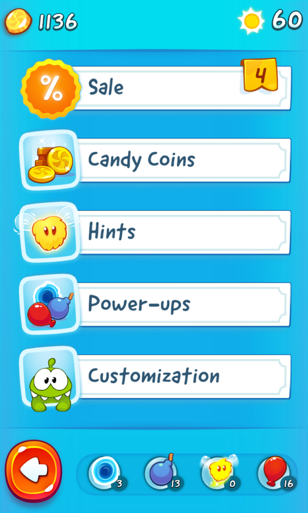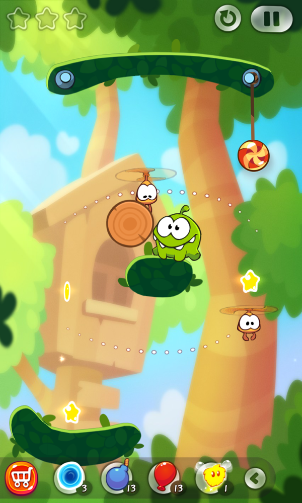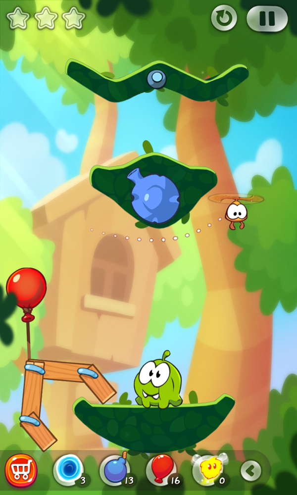 时下最流的是什么?没错,内购商城!Cut the Rope 2 当然也不会放过这实打实的挣钱机会,除了机能性的道具外,你还可以在商城中购买多种萌属性饰品,为 Om Nom 装扮一番。