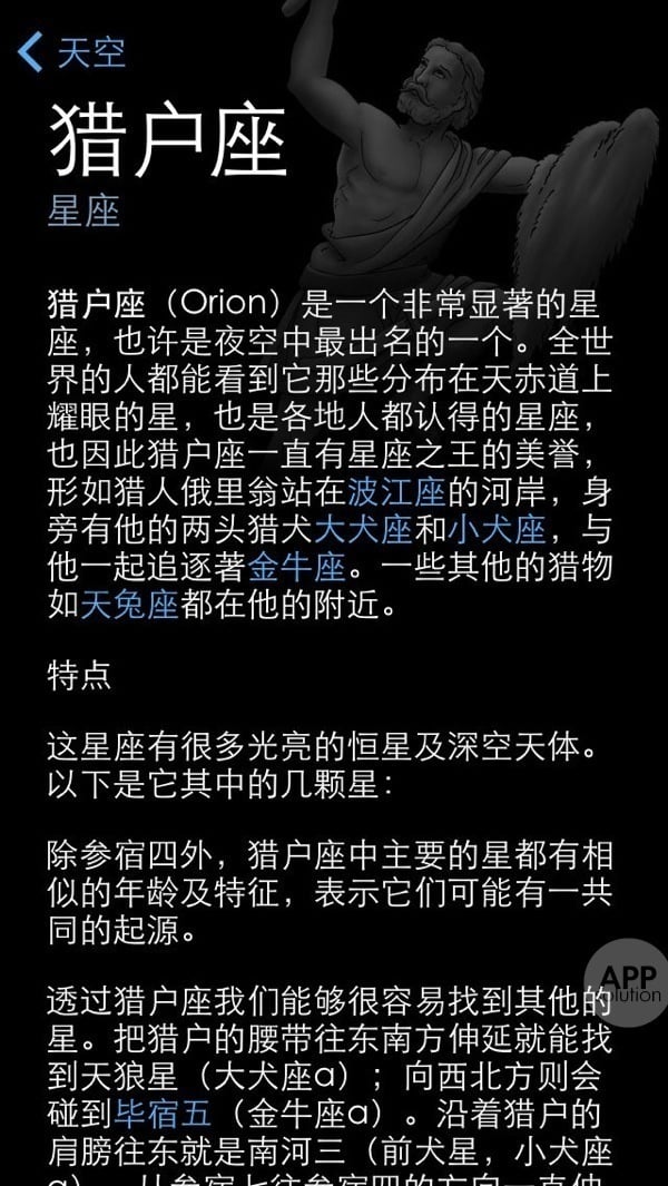 选中星座,按下右边的ⓘ,即可查看星座介绍。Sky Guide 中包含上万篇摘自维基百科的文章,记录着全天的大部分天体,没有网络也可以随意查看。