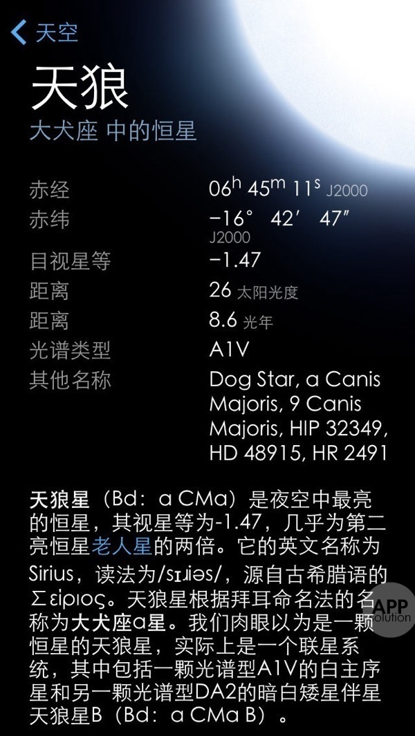 选中星空中的一颗恒星,Sky Guide 会根据其亮度的不同发出高低不同的声音,并为你提供高清的计算机模拟图,以及列出距离、目视星等、赤经、赤纬等参数。