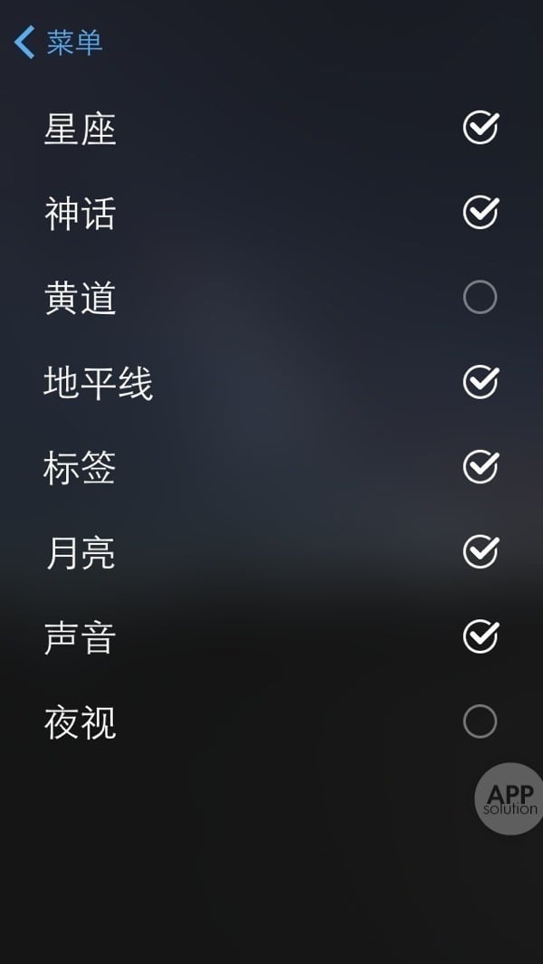 在设置中,你可取消勾选不需要查看的内容,让屏幕上的星空更开阔一些。