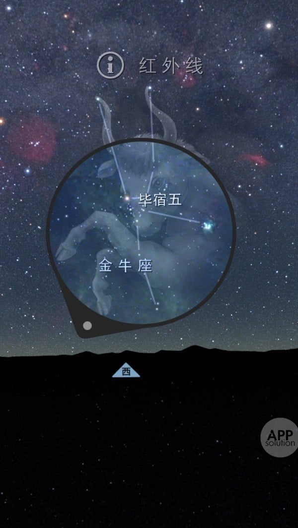 Sky Guide 有两种查看模式:手动查看和加速计辅助追踪。四处滑动屏幕以手动浏览,或是将屏幕朝向自己举过头顶(即自拍时的姿势),应用即会自动定位到当前位置的星空,显示出对应的星座和天体名称,同时浮出假想的星座图示。
